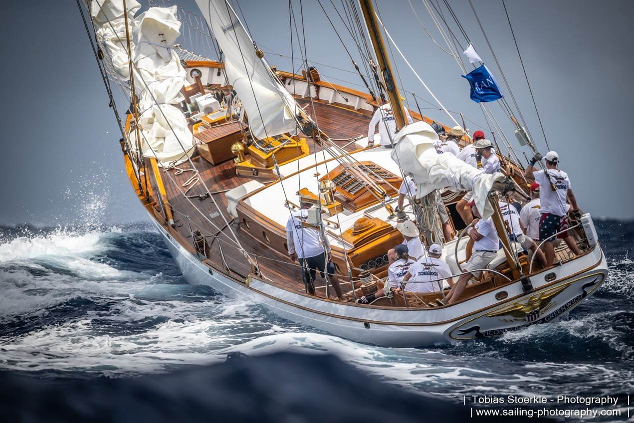Never intended to be an ocean racer, TICONDEROGA, an 86 foot ketch, won her continuing global fame on the basis of an extended series of extraordinary racing victories that spanned six decades on two magnificent oceans, several stormy seas and along the coasts of three continents. She finished first in 24 of her first 37 racing starts between 1936 and 1951. During her most productive racing years, from the end of WWII though 1967 when she probably should have been retired with new more competitive hull materials coming into existence, she was first to finish countless times and broke dozens more records. Racing yachts – again, she was not designed to compete – are not designed for aesthetics, yet she is deemed by many to be one of the most graceful yachts ever designed.
