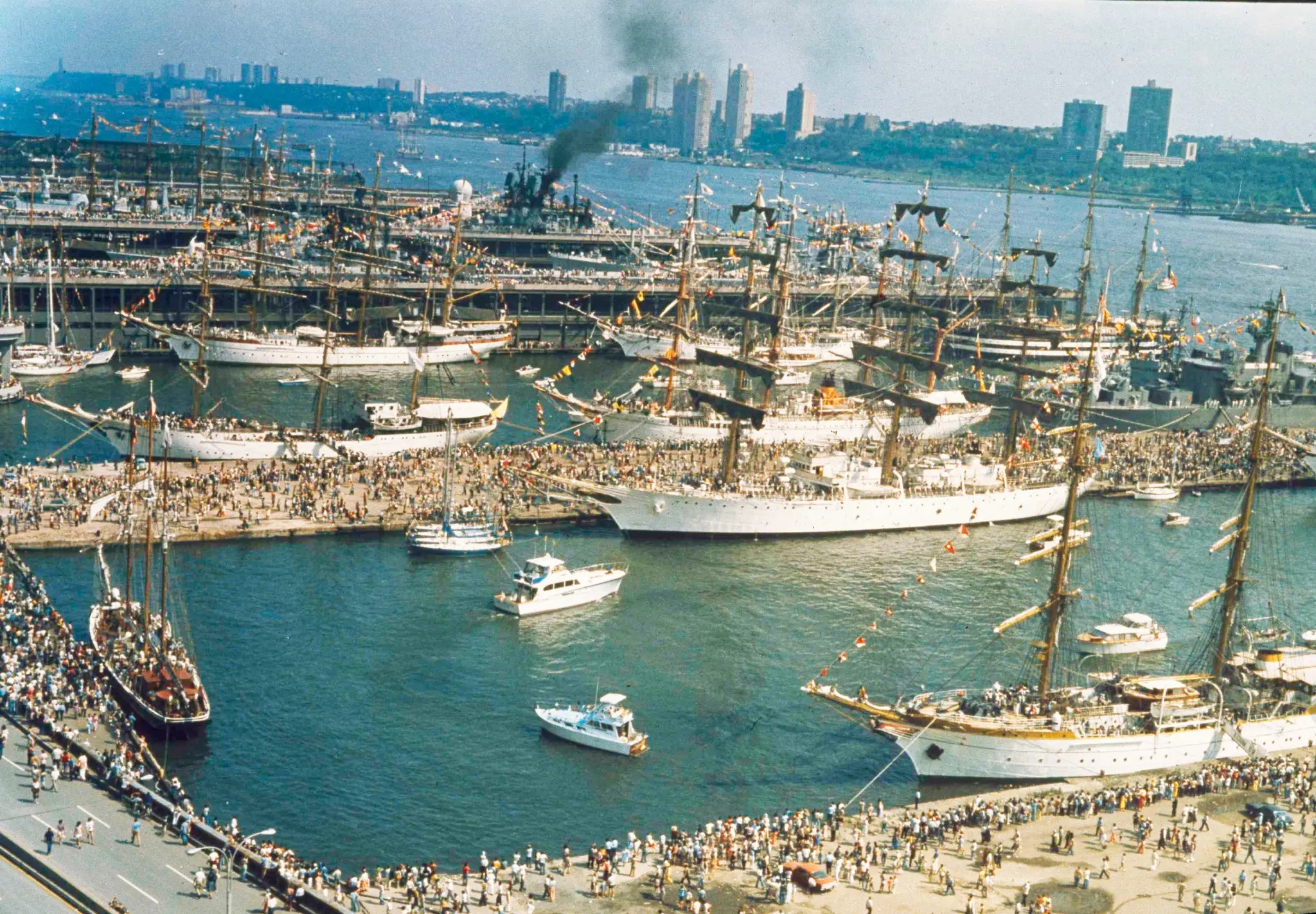 Visiting tall ships pictured in the harbor on July 4, 1976. AP