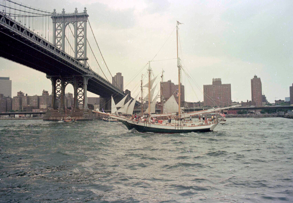 A tall ship in the East River near the Manhattan Bridge during Operation Sail on July 4, 1976. Credit: Associated Press