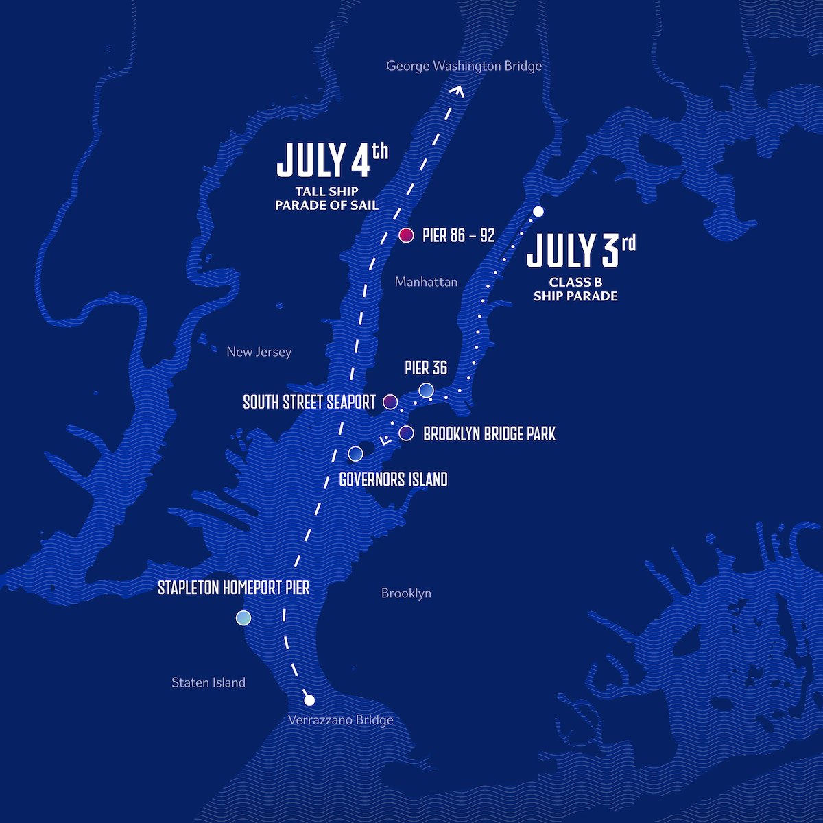 The New York celebration calls for a July 3rd parade of the smaller, but equally impressive Class B tall ships down the East River. The next morning, the majestic Class A international tall ships will sail from the Verrazzano Bridge, past the Statue of Liberty, up the Hudson River to the GW Bridge and beyond.